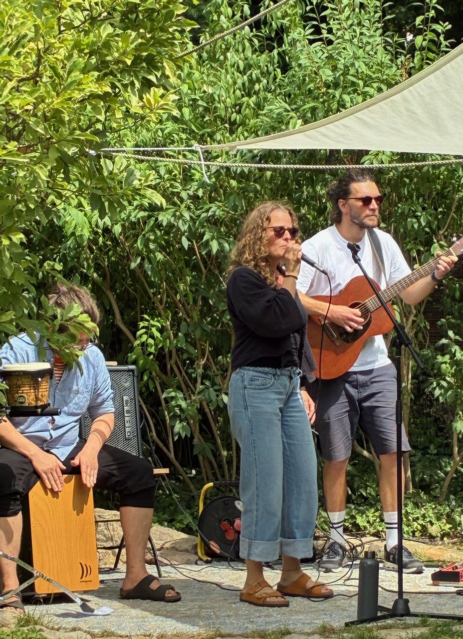 Warum also doch ‚Party’? – Für mich fordern „Events“ wie Sommerfeste und Partys einiges an Selbstüberwindung ab, deshalb drücke ich mich normalerweise vor ‚sowas‘. Vielleicht ging es manchem der Partner so, die unsere Ausbildungskandidatinnen mitbrachten. Mann hatte seine liebe Mühe damit, irgendwo Gesprächsanschluss zu knüpfen. Zu Hilfe kam die Live-Musik und natürlich das selbst zusammengestellte Buffet – auch hier folgte man der Tradition und verschmähte ‚professionelle‘ Catering-Hilfe. Vergessen sei nicht, was unbemerkt supportiv mit am Werke war: Was uns umgab, zeugte von einer durch menschlichen Einsatz formbaren Welt, die sich der Allgegenwart einer Wegwerfkultur entgegenstellte. Wie alles Schöne sprach sie wortlos davon, dass hier Gut-Bleiben war. Auch dieses „Setting“ trug zum Heimatgefühl bei. Selbst das Wetter spielte mit und die Sonne, von der Ingeborg Bachmanns Gedicht zuvor gesprochen hatte, leistete ihren erhellenden Beitrag zum Gelingen.